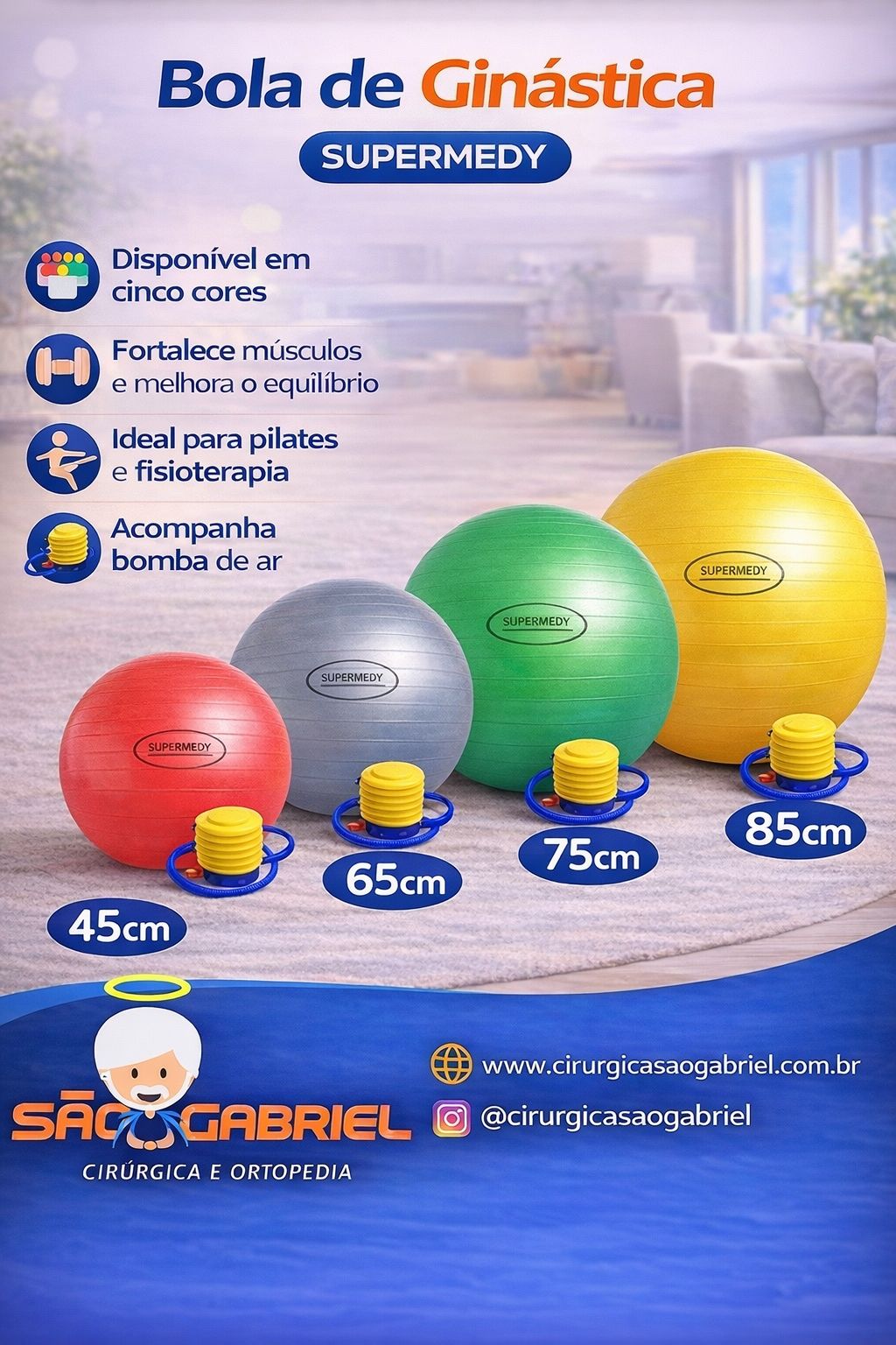 As bolas de ginástica supermedy tem alta qualidade de fabricação, resistem a 200 kg de impacto e possuem sistema antiburst (anti explosão) o que permite o uso seguro inclusive em atividade que envolva força, equilíbrio e potência. as bolas ajudam na coordenação motora global, tônus muscular, correção de coluna, alongamento e flexibilidade, por isso são amplamente utilizadas em terapias correlatas. acompanha bomba de encher e disponibilidade em 5 tamanhos.