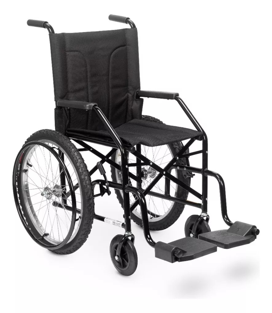 Fabricada em aço carbono, pintura epóxi, dobrável em x, assento/encosto em nylon almofadado, apoio para braços fixos, apoio para os pés fixos, freios bilaterais, aro impulsor bilateral, rodas dianteiras aro 06" com pneus maciços e rodas traseiras aro 20" em alumínio com pneus infláveis.