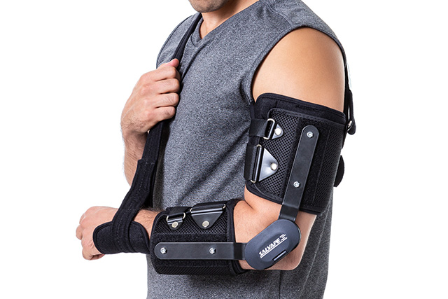 Imobiliza e estabiliza o cotovelo. Sistema de travas duplas oferece limitação da flexo-extensão do cotovelo de 0º à 110º, com incremento inicial de 10º e incrementos posteriores de 20º. Permitindo tanto o bloqueio total em um ângulo fixo quanto limitação a um arco reduzido de movimento.