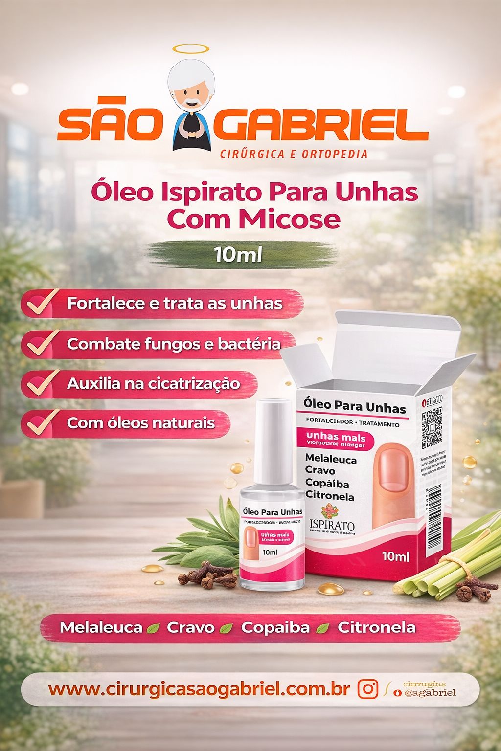 O Óleo Ispirato para Unhas com Micose, foi desenvolvida com, óleo de melaleuca, citronela e cravo, para ajudar a eliminar e prevenir os microorganismos causadores da micose da unha.